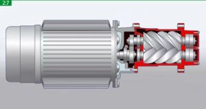 臺(tái)雙螺桿式空壓機(jī)有對(duì)稱(chēng)轉(zhuǎn)子型線,壓縮室內(nèi)沒(méi)有使用的任何冷卻液。這些被稱(chēng)為無(wú)油或干螺桿式空壓機(jī)?,F(xiàn)代、高速、無(wú)油螺桿式空壓機(jī)的螺桿非對(duì)稱(chēng)配置,因?yàn)闇p少了內(nèi)部泄漏,所以大幅度提高了能量的使用效率。