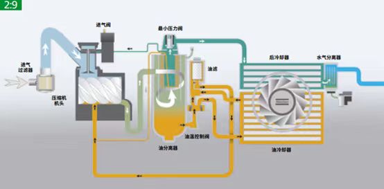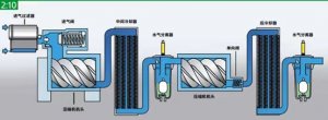 在液體式螺桿空壓機(jī)中,液體進(jìn)入壓縮室,也經(jīng)常會(huì)進(jìn)入空壓機(jī)軸承。其功能是冷卻并潤(rùn)滑空壓機(jī)的運(yùn)動(dòng)部件、冷卻在內(nèi)部被壓縮的空氣,并減少返回進(jìn)氣道的泄漏。